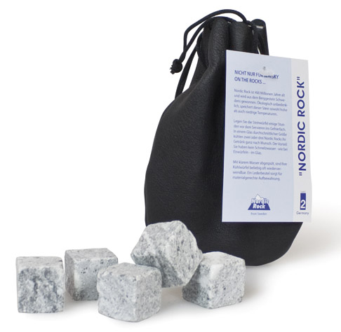 Ces cailloux vieux de 400 millions d'années sont extraits du sol suédois dans des endroits éloignés de toute pollution. Ils ont pour propriété de très bien emmagasiner le froid puis de le restituer tout aussi efficacement. Il suffit de les laisser 1 heure au congélateur, puis de les servir avec une boisson pour la raffraîchir sans la diluer (2 à 3 cailloux par verre). Inutile de vous dire que pour un whisky "on the rocks", c'est le top. Sans compter que des cailloux dans un verre, ça ne passe pas inaperçu.