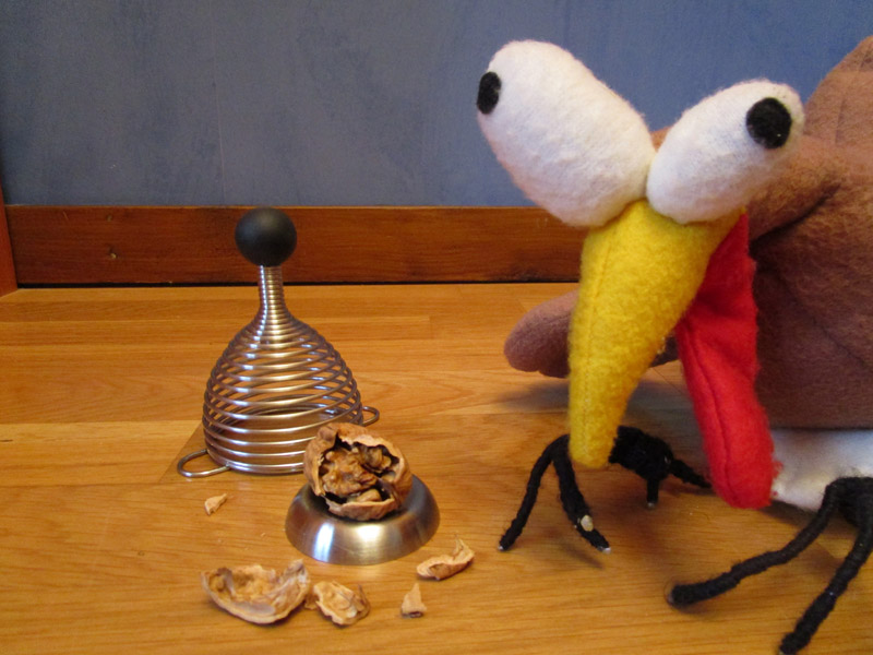Les noix, c'est trop bon, mais c'est toujours un casse-tête pour les ouvrir ! Il fallait y penser : plutôt que de s'épuiser avec une pince casse-noix classique, il est plus simple d'utiliser l'énergie naturelle d'un ressort. On place la noix dans la soucoupe, on étire le ressort, et vlan ! Une coquille en moins. Ca marche très bien et en plus c'est rigolo.