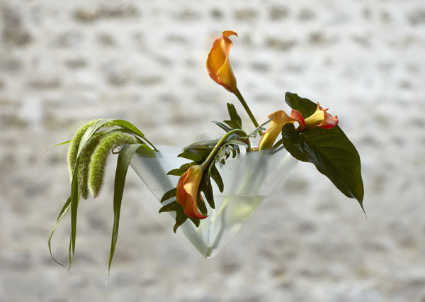 Translucid est un vase en plastique souple et transparent qu'on peut accrocher sur toutes les surfaces verticales grâce à ses deux ventouses.