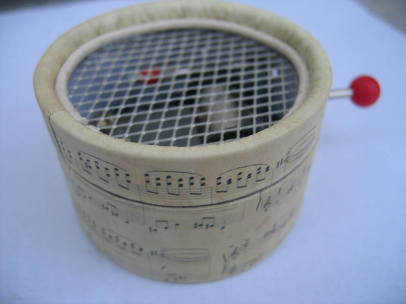 In our music box, you can see a metallic cylinder with raised surfaces (each of which corresponds to a note). When you turn the handle of the music box, the cylinder rotates, and every time one of the raised bumps hit the 'mini pianio' inside the box a beautiful note is played.