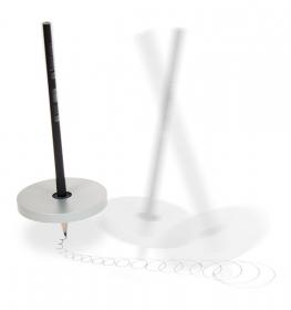 Put a pencil through the solid aluminium disc’s center and set the writing tip facing down. Now give the wheel a firm turn between both your hands, and the top – with some manual practice – will draw its tracks on the horizontal plane of paper.