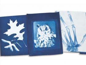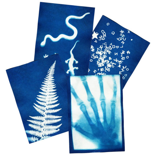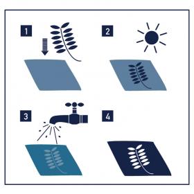 Si l'on pose un objet sur le tissu lors de l'exposition (une fleur, des couverts, un grillage...), les parties cachées gardent leur couleur d'origine alors que le reste noircit. Et si l'on pose un film avec des niveaux de gris, il s'imprime "en négatif" sur le papier. C'est tout simplement le principe du développement des photos.