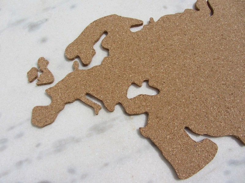 Beaucoup plus original qu'un simple rectangle de liège, beaucoup plus utile qu'une carte du monde... Voici un panneau de liège découpé avec la forme des continents ! On peut y accrocher ses petites notes et ses photos de voyages, mais on peut tout aussi bien le garder vierge, simplement pour décorer une pièce.